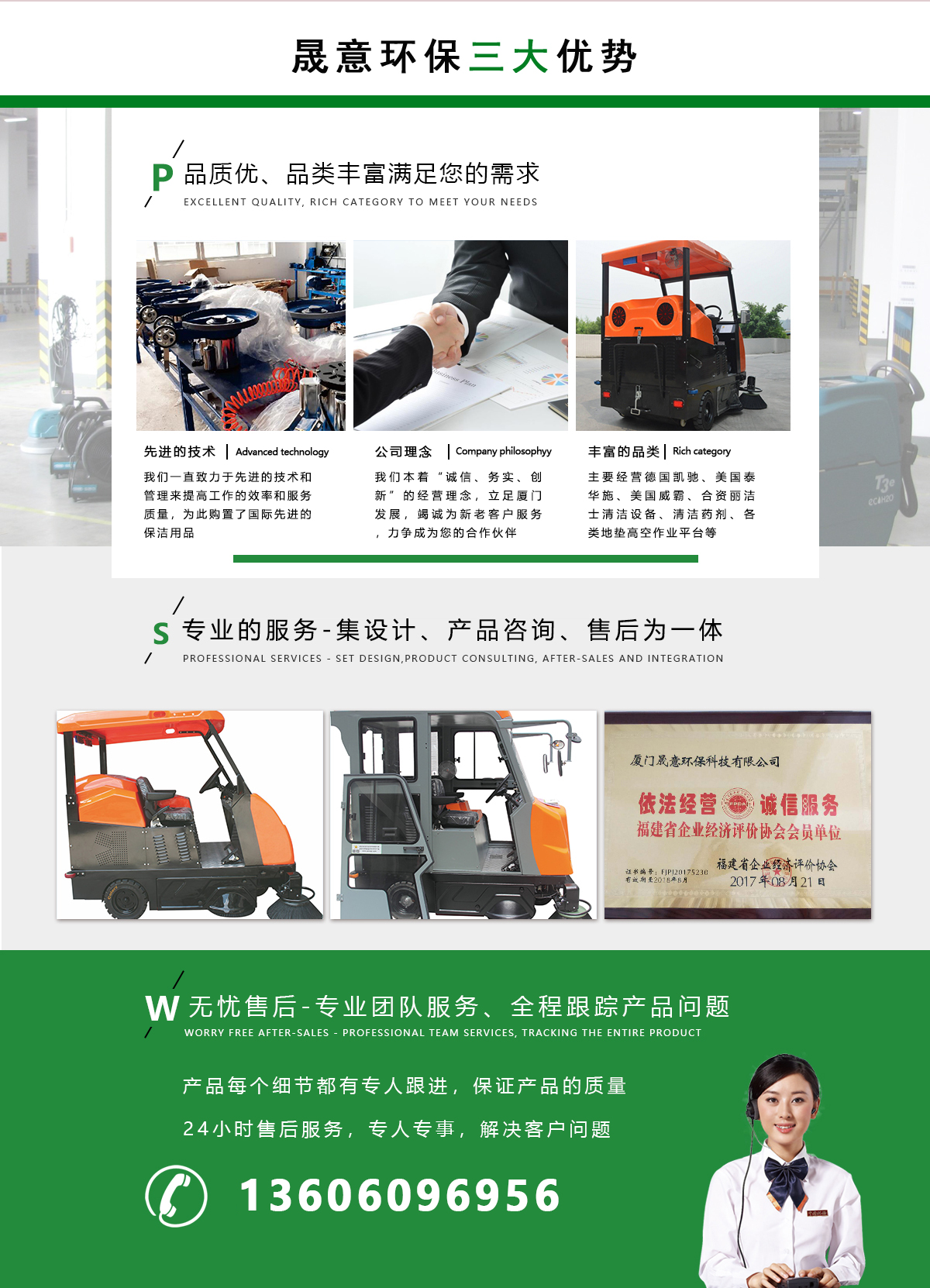 我司是2003年開始專業(yè)從事清潔設(shè)備銷售與石材護(hù)理保養(yǎng)服務(wù)為一體的綜合性公司。主要經(jīng)營(yíng)德國(guó)凱馳、美國(guó)泰華施、美國(guó)威霸、合資麗潔士清潔設(shè)備、清潔藥劑、各類地墊、高空作業(yè)平臺(tái)等。供應(yīng)、酒店、大型工廠、物業(yè)等單位使用。目前我司服務(wù)的四、五星級(jí)酒店超過(guò)100家如艾美酒店、喜來(lái)登酒店、溫德姆、郎豪等國(guó)家國(guó)內(nèi)連鎖品牌。廈門國(guó)家電網(wǎng)、七匹狼、鴻星爾克等是我司常年保潔單位。銷售產(chǎn)品:廈門洗地機(jī)、廈門掃地機(jī)、廈門石材護(hù)理、保潔設(shè)備、...